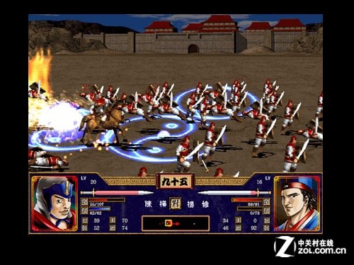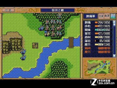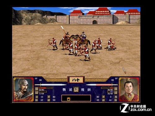 在多层卷轴伪3D的表现形式下,《三国群英传》为我们展现出了一个临场感极为震撼的战场。同屏几百人同时打斗的场面即使是在现在最新的《真三国无双6》中也很难见到,虽然那些士兵都是纸片。这种表现手法确实很像家用机平台上的《半熟英雄》系列,但在三国背景的烘托下,这种多层卷轴展现战争场面的形态效果确实不错。